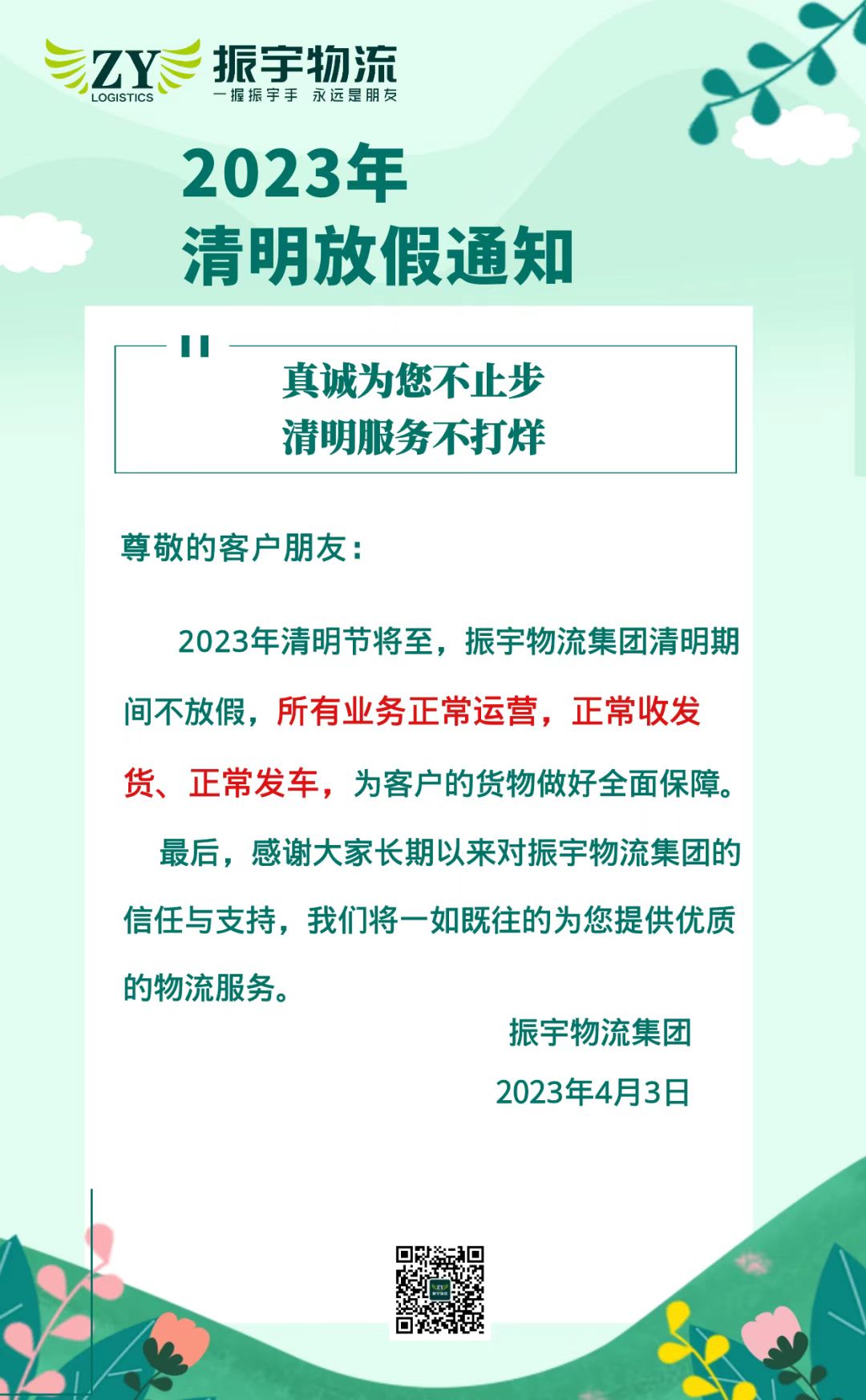 2023年清明節(jié)將至,振宇物流集團清明期間不放假,所有業(yè)務(wù)正常運營,正常收發(fā)貨、正常發(fā)車,為客戶的貨物做好全面保障。最后,感謝大家長期以來對振宇物流集團的信任與支持,在此祝您度過一個愉快的假期。