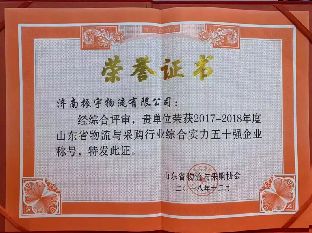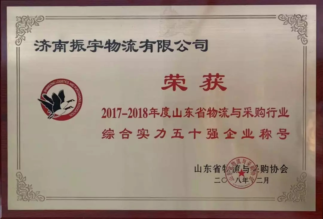 振宇物流經(jīng)山東省物流與采購協(xié)會綜合評審,榮獲2017-2018年度山東省物流與采購行業(yè)綜合實力五十強企業(yè)稱號。