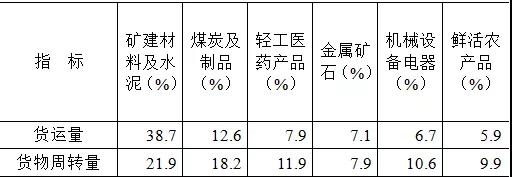 貨運(yùn)量的主要貨類構(gòu)成中,“礦建材料及水泥”占比最高,為38.7%;其次是“煤炭及制品”,占比12.6%;“輕工醫(yī)藥產(chǎn)品”“金屬礦石”“機(jī)械設(shè)備電器”“鮮活農(nóng)產(chǎn)品”等貨類次之,占比分別為7.9%、7.1%、6.7%和5.9%。