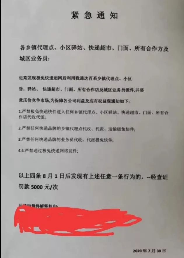 7月底,有某通達(dá)系快遞總部下發(fā)通知,要求全網(wǎng)各網(wǎng)點(diǎn)禁止代理極兔速遞業(yè)務(wù),通知指出,攬派兩端加盟公司不得以任何理由、任何形式代理極兔速遞業(yè)務(wù)。還有通知指出,如果通達(dá)百系中鄉(xiāng)鎮(zhèn)代理點(diǎn)、小區(qū)、驛站、快遞超市等業(yè)務(wù)員因惡性低價(jià)競(jìng)爭(zhēng)攬收極兔速遞的,經(jīng)查證,每次予以5000元罰款。
