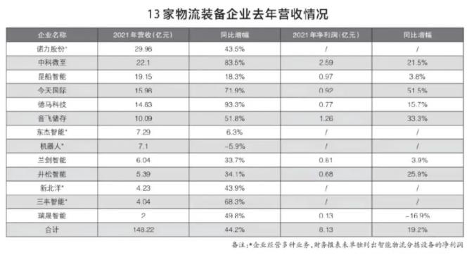 截至4月30日,A股主要上市企業(yè)均發(fā)布年報(bào),其中包括以智能物流分揀系統(tǒng)為主要業(yè)務(wù)的11家企業(yè),加之即將IPO的2家企業(yè)披露全年業(yè)績,13家企業(yè)2021年?duì)I收合計(jì)為148.1億元,2020年為102.8億元,增長44.2%(見圖表)。