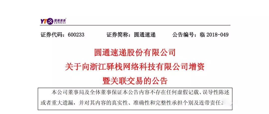 根據(jù)公告,圓通擬以自有資金4.5億元人民幣對(duì)浙江驛棧進(jìn)行增資,其中1575萬元人民幣認(rèn)繳新增注冊(cè)資本,4.3425億元人民幣計(jì)入資本公積金。本次投資后,公司將持有浙江驛棧1575萬元人民幣注冊(cè)資本,持股占增資完成后比例為6.28%。